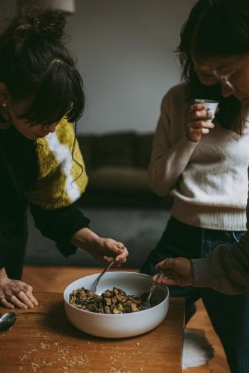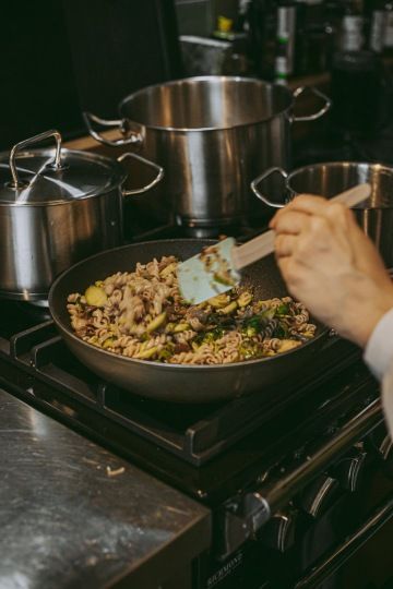 ✺Na ghí orestujeme šalotku, přidáme houby a kmín, potom přidáme kapustičky, které jsme nakrájeli na menší kusy, přidáme těstoviny, petržel a vše promícháme.