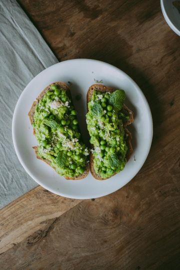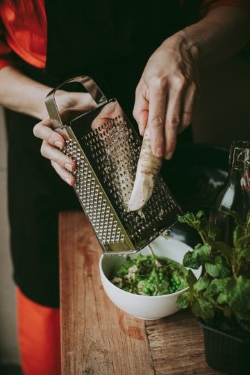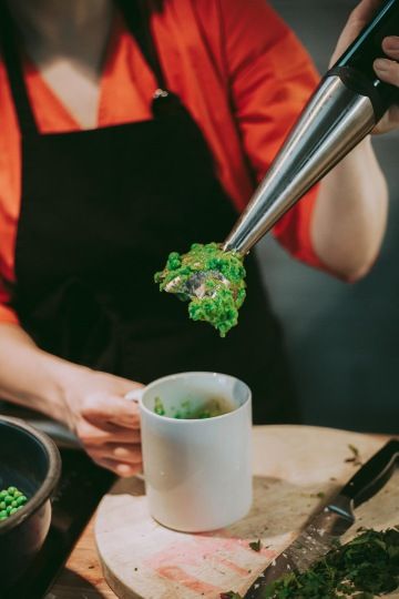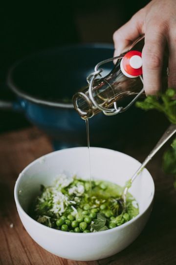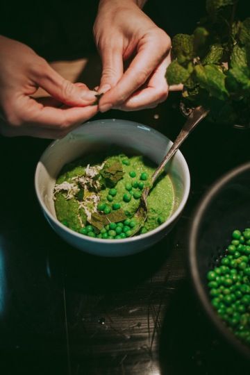 ✺Část hrášku rozmixujeme do hladka a přidáme nastrouhaný křen, oliváč, nasekanou mátu a zbytek hrášku, dochutíme.