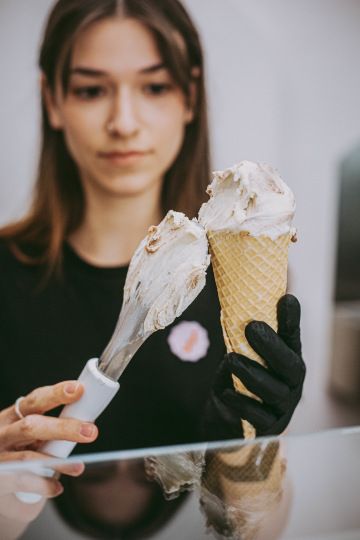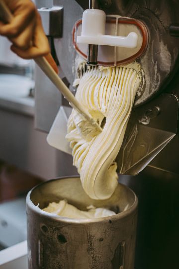 Základ každé zmrzliny v Ještě jednu vzniká takzvanou teplou cestou. Vychází nejčastěji z bílé - mléčné báze, případně žluté (s vaječnými žloutky) nebo čokoládové. Každý recept je pečlivě propočítaný tak, aby výsledná směs měla správný poměr tuku, cukru a sušiny. „Jde o to, aby se při výdejové teplotě všechny chovaly podobně – žádná netekla nebo nebyla naopak tvrdá jako led,“ vysvětluje Jakub.