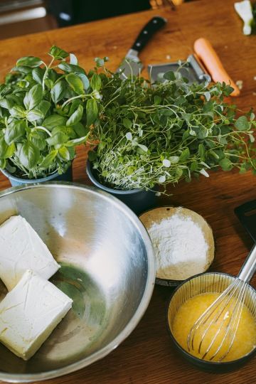 ✺Dvě vejce spolu s 50ti gramy rozpuštěného másla krátce prošleháme metličkou. Směs přidáme k půl kilu tvarohu, 50ti gramům kukuřičného škrobu a cca 25ti g čerstvých divokých bylinek, natrhaných v trávě, na louce nebo v lese. Osolíme, opepříme a promícháme.