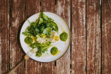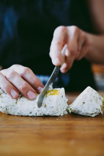 ✺ Po úplném vychladnutí rozbalíme a krájíme. Na talíři dozdobíme směsí rukoly, divokých bylinek, microgreens a jedlých květů, které zakápneme ochuceným olejem a trochou soli.