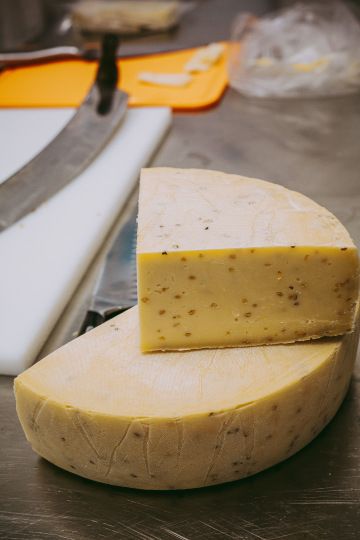 Sýřenina se zahřívá – podle typu sýra buď na 36 až 38 °C, nebo až na 46 °C. Místnímu sýru vyhovuje teplota 42 °C. Krájí se na jemná zrna, velká jako kukuřice. O tom, zda je ten správný čas ustat s krájením a kdy má zrno tu správnou tuhost, rozhoduje zkušená ruka vedoucí sýrárny. „Celý proces přípravy zrna trvá necelou třičtvrtě hodinu. Sýrařka vezme zrno do dlaně a rozhodne, jestli už je čas ho přelít do vany a následně lisovat,“ vysvětluje Bára.